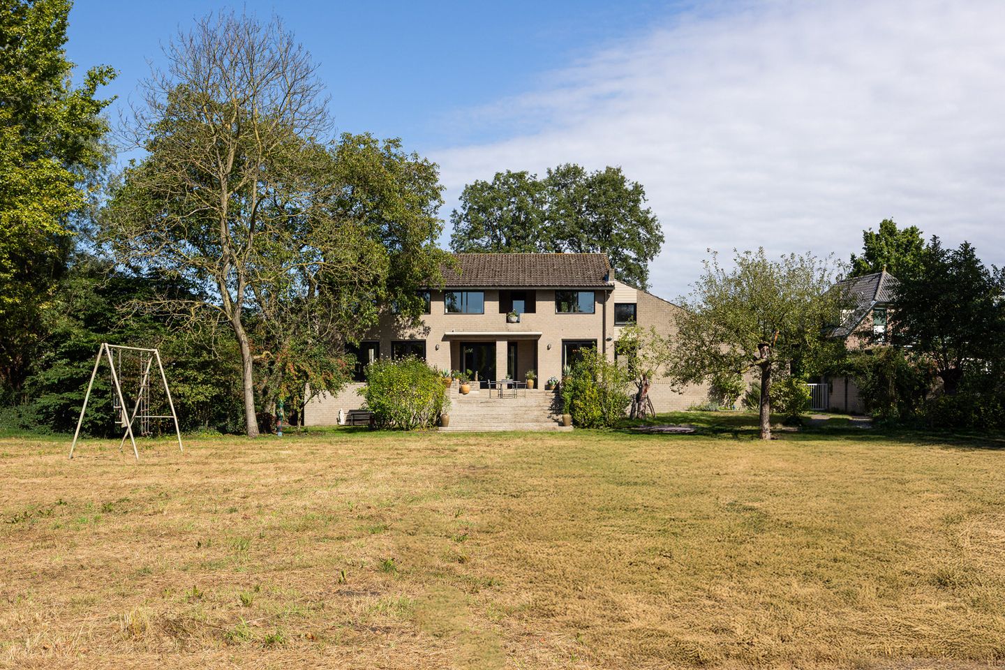 Ook de tuin maakt het huis bijzonder. Aan de voorzijde een kleine voortuin en een royale oprit met plaats voor meerdere auto’s, die toegang geeft tot de dubbele garage. Aan de achterzijde ligt een verhoogd terras met zonnescherm, bereikbaar vanuit de zitkamer, tussenkamer en eetkamer. Vanuit het terras heeft u een fantastisch uitzicht over de riante tuin. Vanaf de brede trappen van het terras loopt u zo de tuin in.