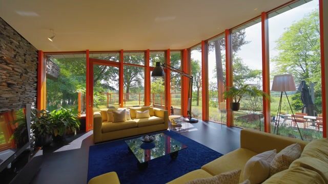 Exterieur: gevels in Ardense leisteen aan de boszijde; aan de valleizijde royale glaspartijen voor een continu binnen buitengevoel.