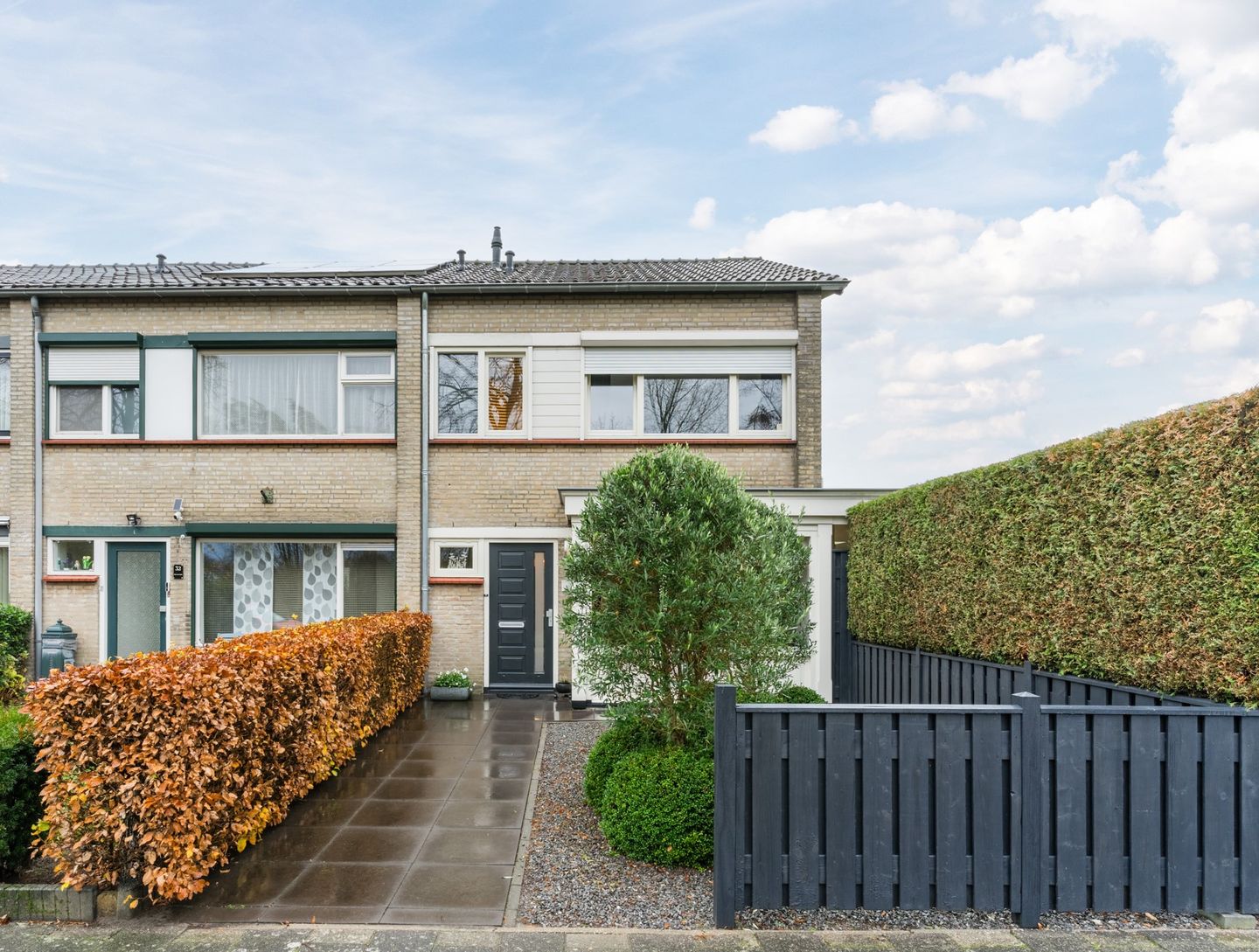 Voortuin: De voortuin is ideaal onderhoudsvriendelijk aangelegd met betegeling, grint, vaste beplanting, hagen en een hekwerk.