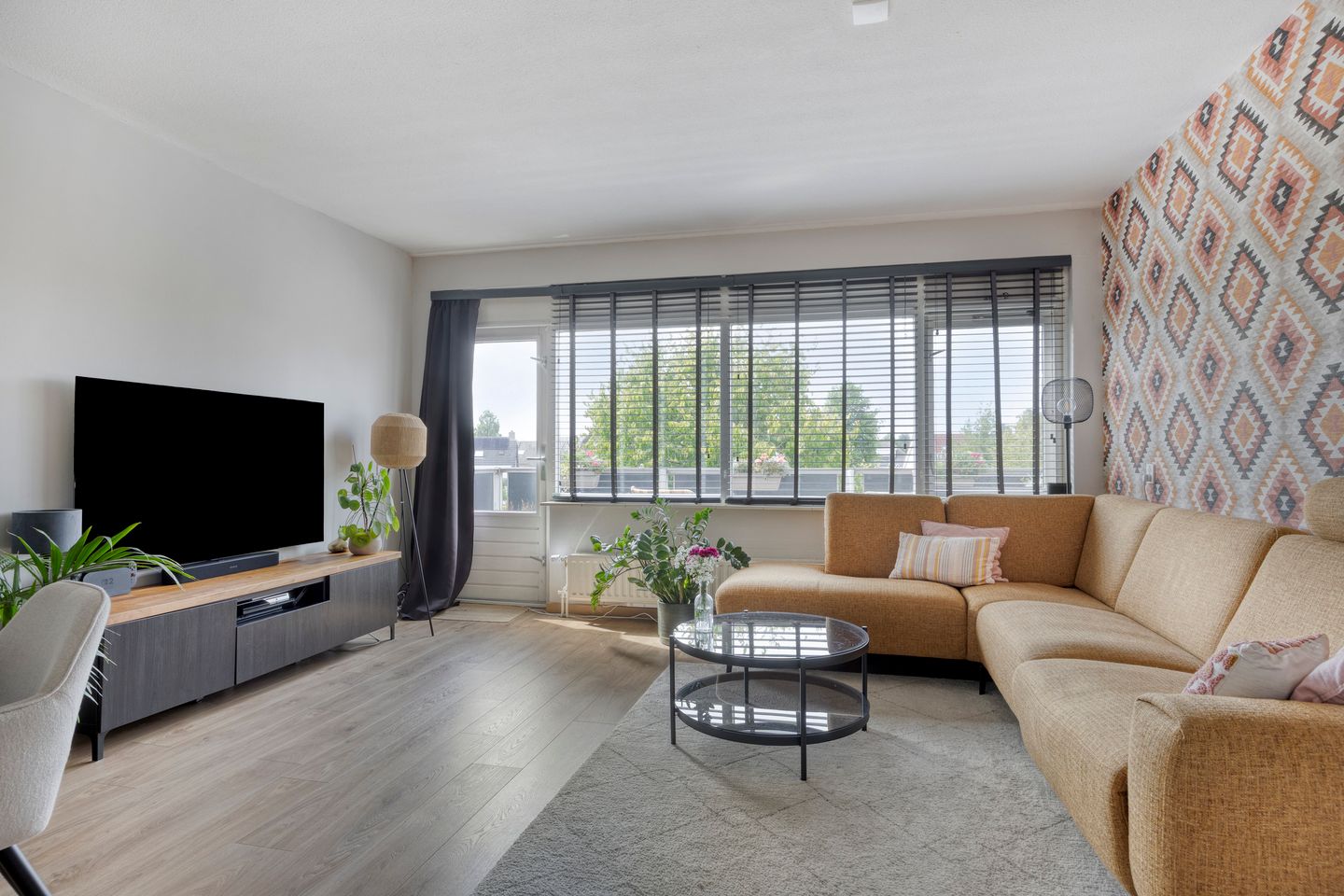 De woonkamer is licht en uitnodigend dankzij de grote raampartijen, en biedt toegang tot het zonnige balkon.