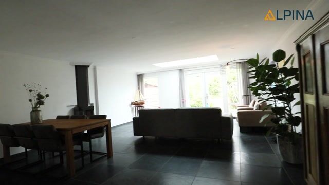 Lopen we langs de toiletruimte en de trapopgang dan komen we in de woonkamer. Deze is uitgebouwd en daardoor zeer ruim van opzet. Het grote lichtstraat lessenaarsdak in de uitbouw geeft een prachtige licht inval.