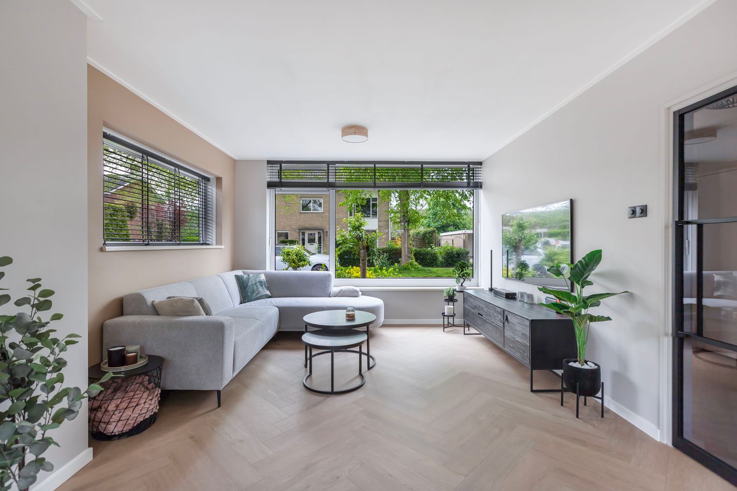 Entree met aansluitend de ruime hal die is ingericht met het toilet met fonteintje, de meterkast, trapopgang, trapkast en biedt toegang tot de woonkamer. Het moderne toilet is in 2024 vernieuwd en voorzien van een fonteintje. De royale hal is ingericht met een open gerenoveerde trapopgang, moderne wandbekleding met Akupanelen en een stalen deur van GewoonGers. Deze stalen deur, voorzien van rookglas, geeft een ruimtelijke beleving in zowel de hal als ook in de woonkamer. De vele raampartijen voorzien de living van veel daglicht. In het jaar 2024 zijn de woonkamer en keuken samengevoegd en is de bijkeuken aangebouwd. De keuken is ingericht met een keukenblok in hoekopstelling, die is voorzien van diverse inbouwapparatuur te weten; een vaatwasmachine, combimagnetron, oven, koel-/vrieskast, inductiekookplaat v.v. een Bora afzuigsysteem. Het geheel is afgewerkt met een composiet aanrechtblad. Aansluitend is de bijkeuken met een tuindeur. In de opening is er rekening gehouden met de wens voor het plaatsen van een deurkozijn. Tevens is de voorbereiding getroffen voor een wasmachine aansluiting. De plafonds op de gehele begane grond zijn strak afgewerkt met stucwerk. Alle kunststof kozijnen, behoudens het toilet en de entreepartij, zijn voorzien van nieuw HR++ isolatieglas. Aangenaam wordt de begane grond verwarmd middels vloerverwarming en is de vloer afgewerkt met een mooie visgraat PVC vloer. Voor de liefhebbers van een houtkachel, in de woonkamer is een rookkanaal aanwezig, deze is heden niet in gebruik.