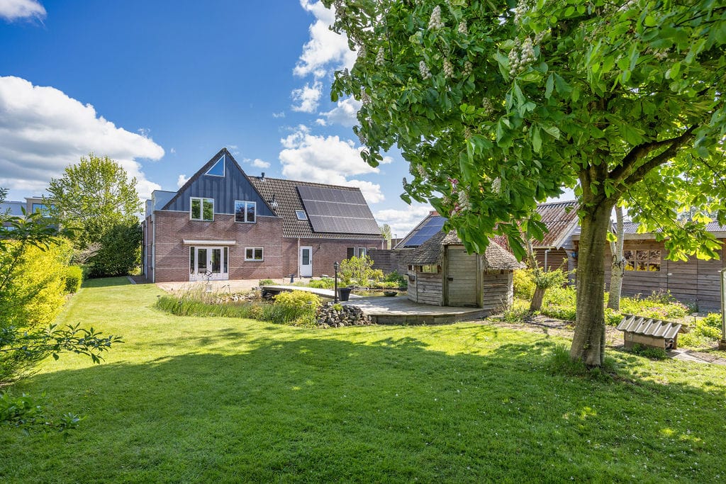 De achtertuin ligt op het zuidwesten (ca. 25x25m), biedt de gehele dag zon, en is ingericht met borders, paden, sierbestrating, zonneterras, vijverpartij met bruggetje en tuinhuisje en een ruim geïsoleerd bijgebouw (ca. 46m2), met aangebouwde berging (ca. 18m2) en veranda/loungehoek. Het bijgebouw is voorzien van een wc en eigen cv-installatie, maar is tevens, met enige aanpassing, te gebruiken als garage of stallingsruimte. Voldoende parkeerruimte voor het gezin en bezoekers op eigen erf.