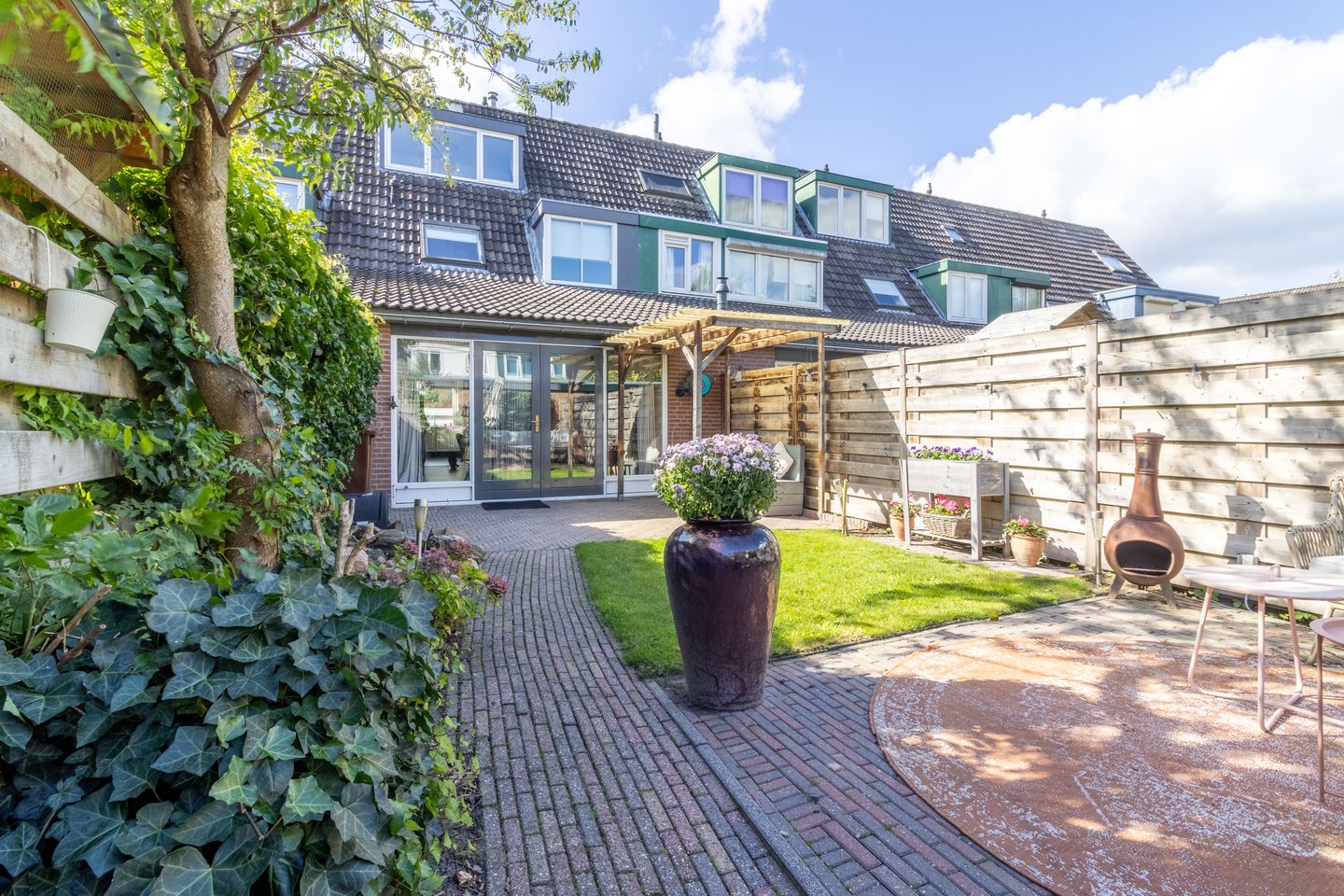 De zonnige achtertuin biedt privacy en grenst direct aan de woonkamer. Hier geniet je in de zomer van rust en ruimte, met plek voor een eettafel, loungehoek en speelruimte. De tuin is voorzien van een berging en een achterom.