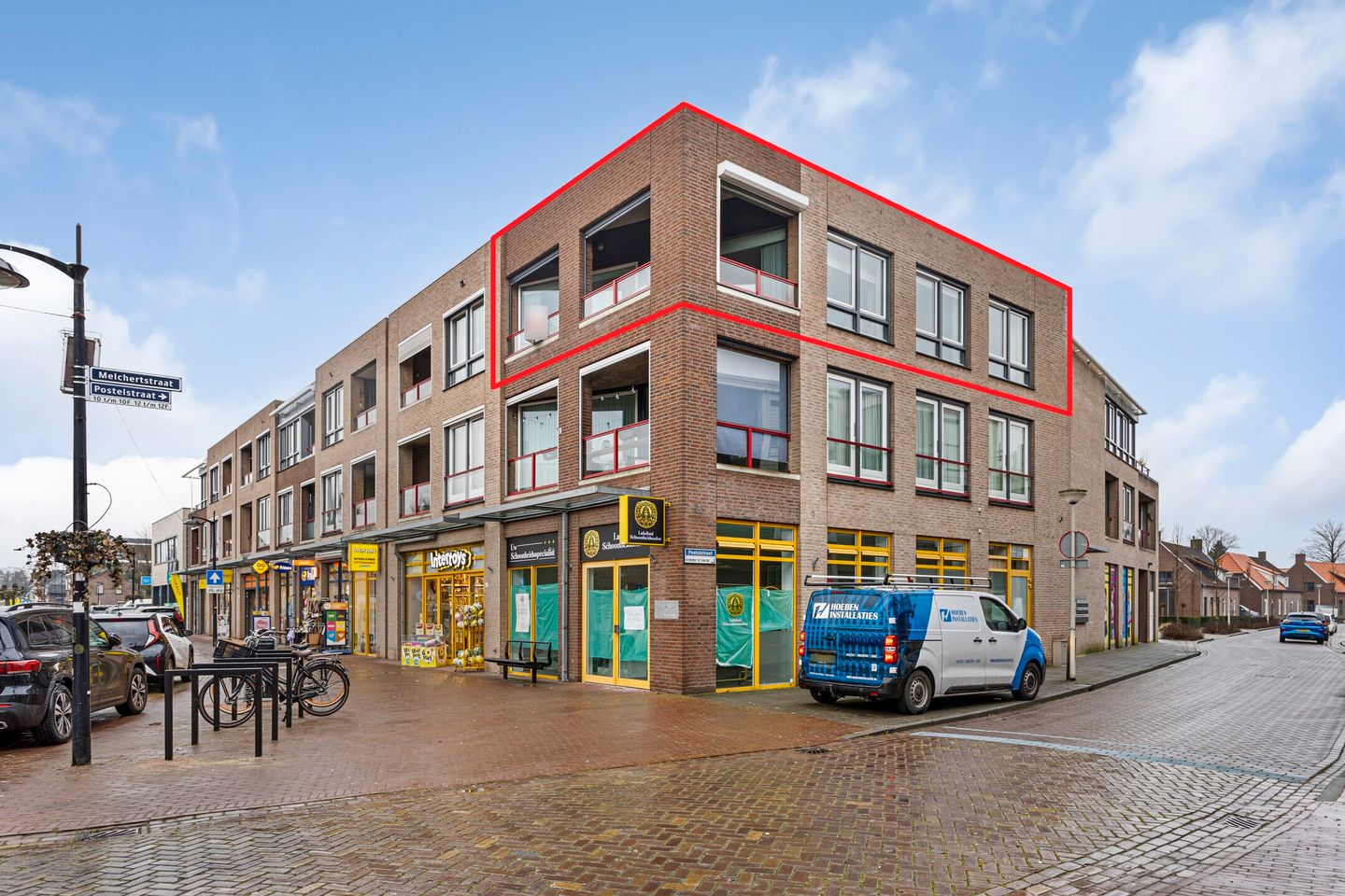 Het balkon, is groot circa 8 m2 (5,94m x 2,54m), en biedt zicht op de Postelstraat.