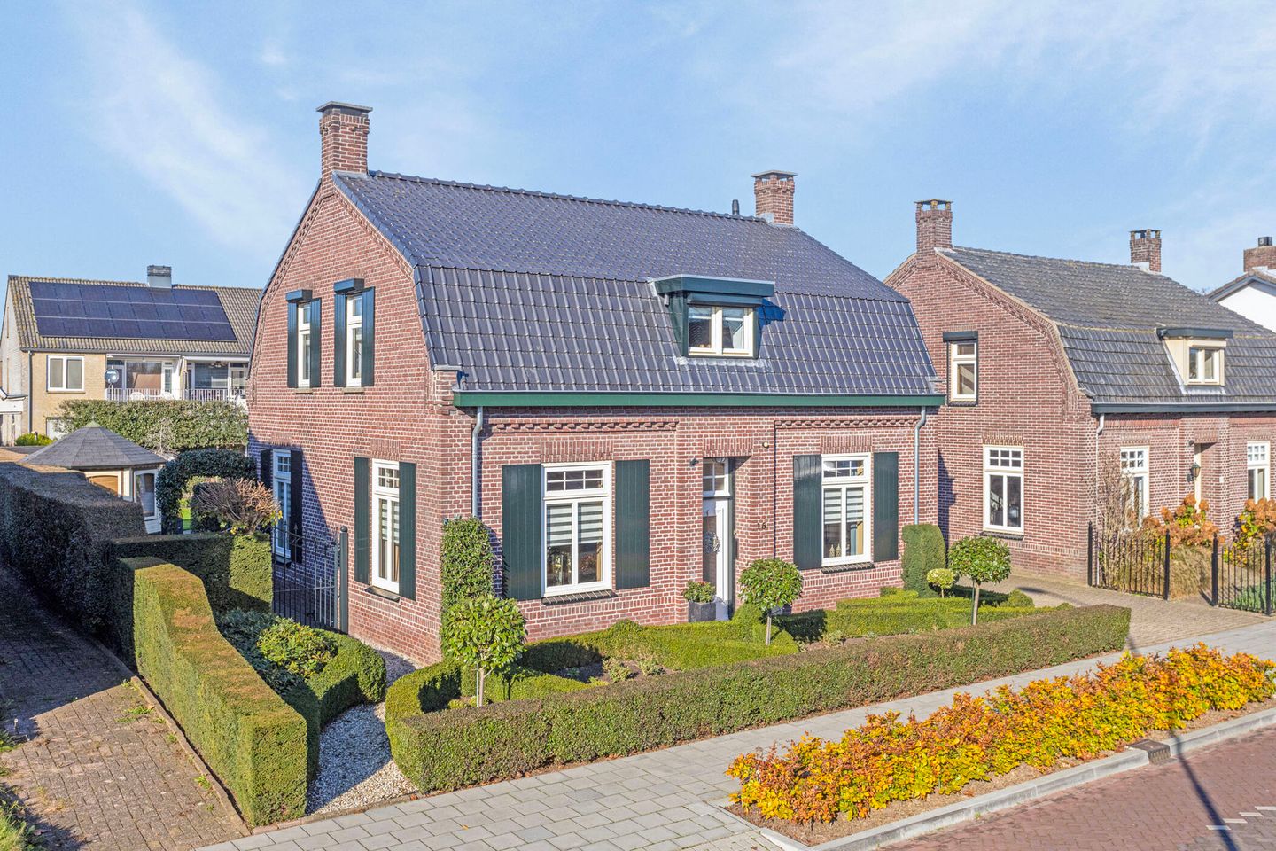 De lange oprit ligt naast de woning. Via de oprit en prachtig aangelegde voortuin is de voordeur bereikbaar.