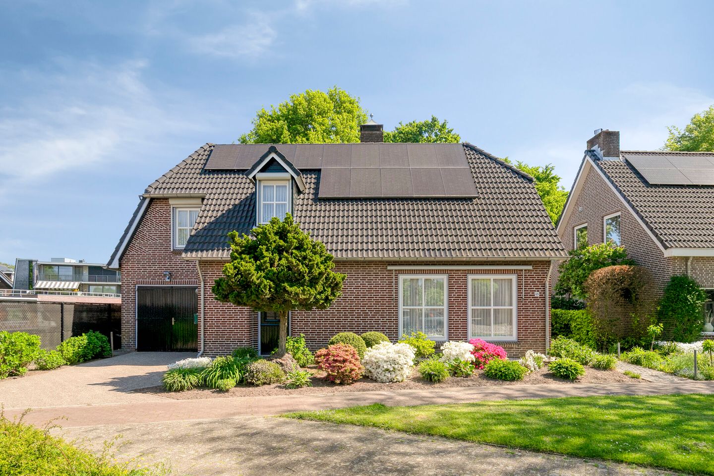 Voorzijde met oprit voor één auto, verzorgde tuin en dubbele achterom. De ‘oprijlaan’ naar de oprit toe biedt gelegenheid om meerdere auto’s te parkeren.
