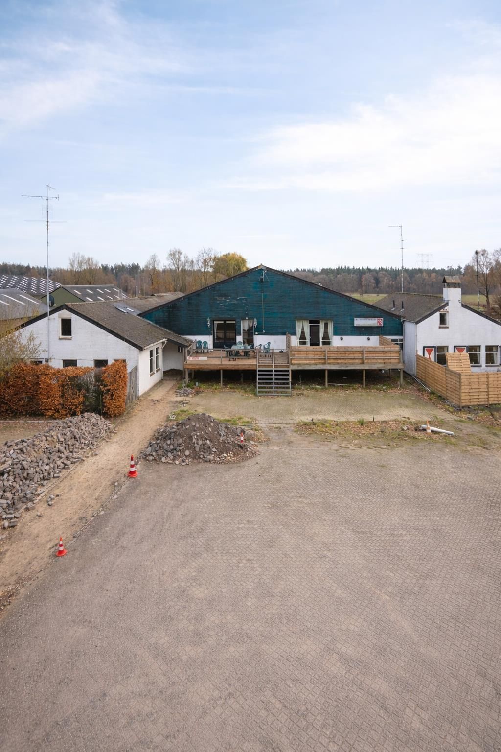 Het erf strekt zich rondom de gebouwen uit en vormt het hart van het geheel. Bij aankomst via één van de twee opritten bereikt u direct het ruime, volledig verharde terrein, uitgevoerd in beton en klinkers. Hier is volop parkeergelegenheid voor auto’s, trailers en bedrijfsvoertuigen, wat de locatie praktisch maakt voor dagelijks gebruik én bezoekers.