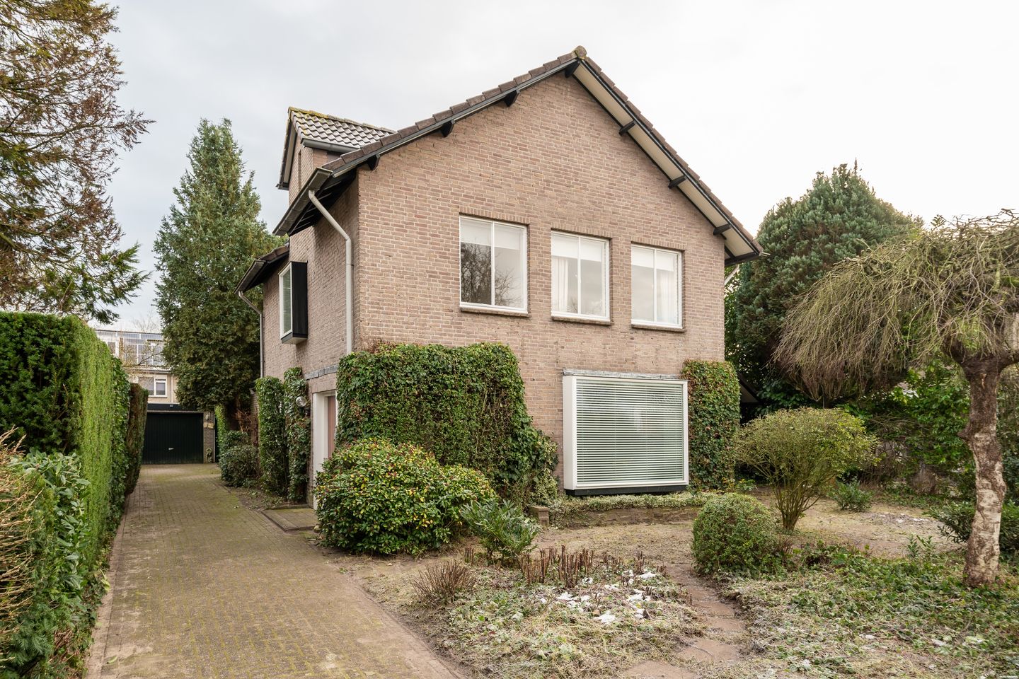 De voortuin van deze woning is verzorgd ingericht met diverse vaste beplanting en een looppad dat naar de zijkant van de woning leidt. Hier bevindt zich een kleine houten berging, ideaal voor het opbergen van tuinspullen.