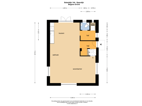 Begane grond; Via de voortuin, waar je op eigen terrein kunt parkeren, kom je via de zijentree de woning binnen. Vanuit de hal loop je de woonkamer in en sta je direct in de open keuken. Vanuit de keuken door middel van openslaande deuren toegang tot de zeer ruime achtertuin. Verder een hal met toiletruimte en bergruimte met opstelling witgoedaansluiting.