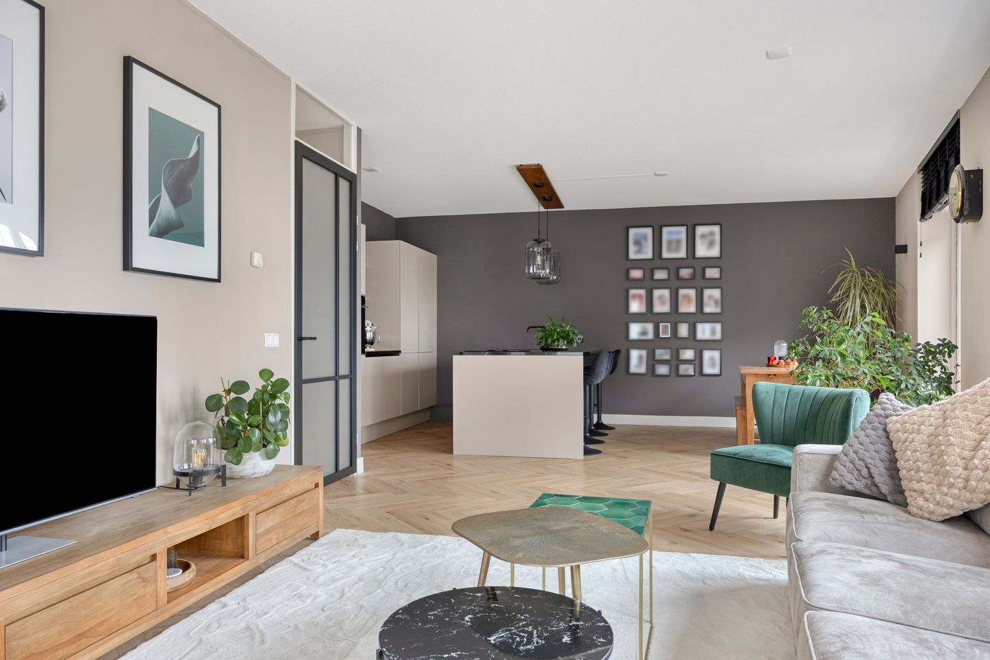 De fijne woonoppervlakte is ingedeeld in drie praktische zones: een royaal zitgedeelte, een moderne open keuken en een gezellige eethoek. Dankzij de open indeling vormt het geheel een sfeervolle en lichte leefruimte waarin je je direct thuis voelt. De keuken is strak afgewerkt en van alle gemakken voorzien. Denk aan een schiereiland, Quooker, zeepdispenser, warmhoudlade, combimagnetron en oven (beide op hoogte), vaatwasser, inductieplaat met ingebouwde afzuiging, koelkast en vriezer. Completer wordt het niet! Direct grenzend aan de keuken is er volop ruimte voor een eettafel waar je heerlijk kunt tafelen met vrienden en familie. Tijdens zonnige dagen zorgen de drie Franse balkons voor een fijne binnen-buitensfeer. Doordat de deuren naar binnen openen, kun je al vroeg in het jaar genieten van het zonlicht en het buitengevoel.