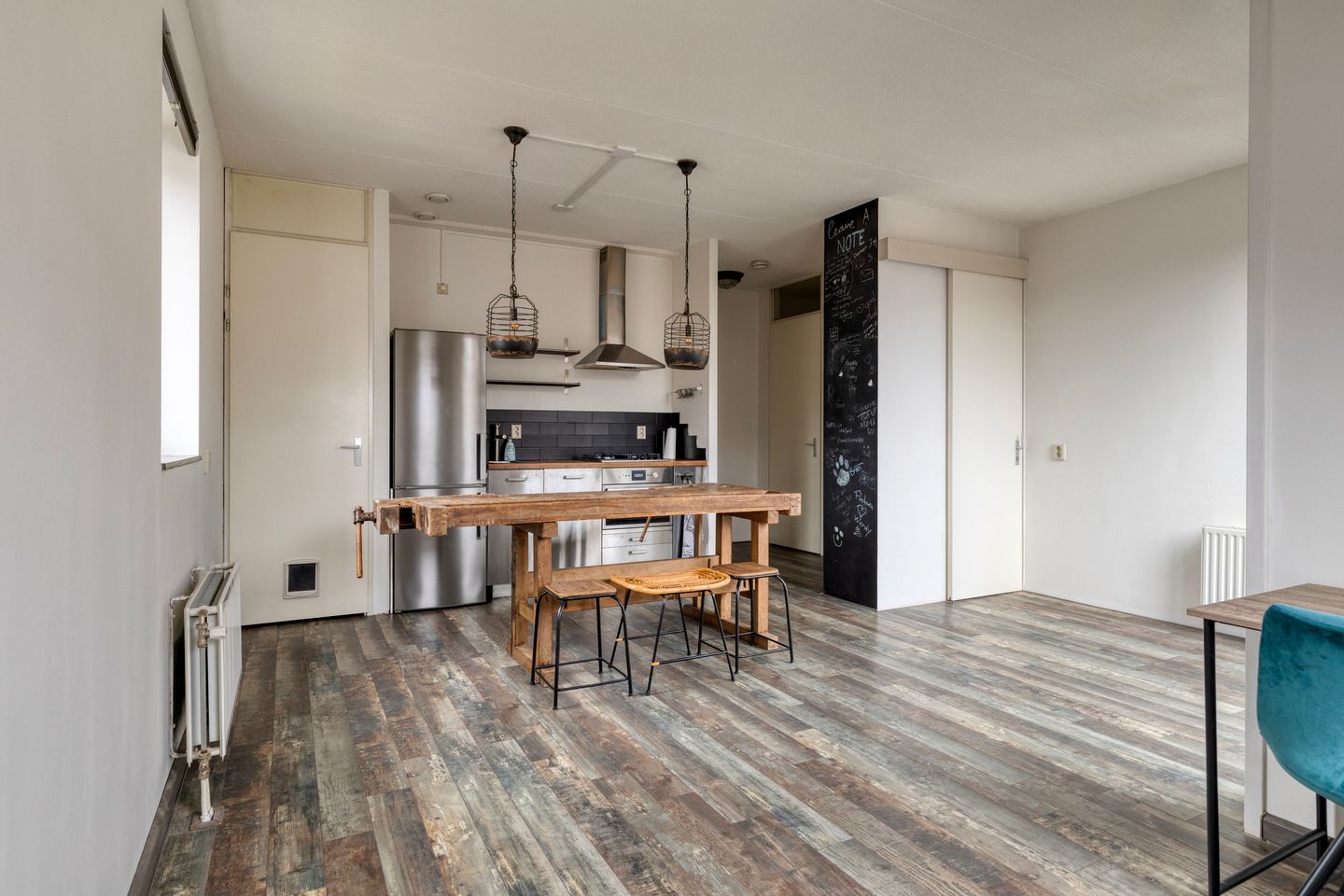 Via een open verbinding heeft u toegang tot de lichte woonkamer welke is voorzien van een laminaatvloer, zijraam en dakraam en een deur naar het beschutte terras op het zonnige zuiden.