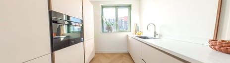Aan de voorzijde van de woning bevindt zich de nieuwe open keuken, uitgevoerd in moderne stijl en voorzien van een complete set ongebruikte Siemens inbouwapparatuur: een inductiekookplaat met ingebouwde afzuiginstallatie, een vaatwasser, een koelkast, een combi-magnetron, én een Quooker voor direct kokend water.