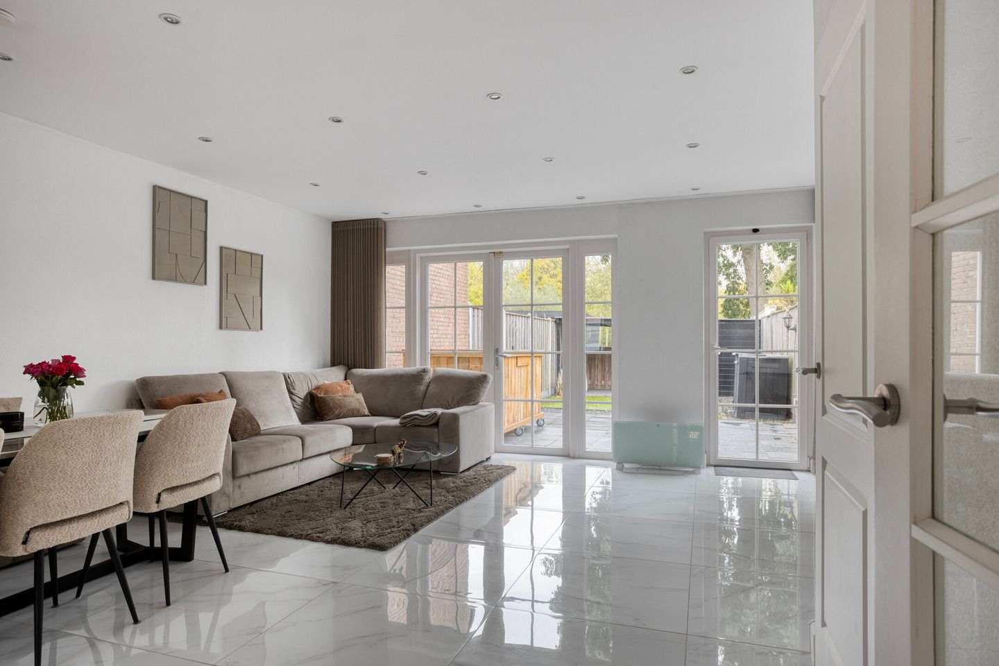 De ruime woonkamer biedt genoeg ruimte voor een eethoek, zithoek en met het groene uitzicht van de tuin een ontspannen omgeving.