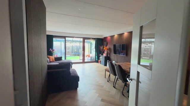 Entree/hal met garderobe, geheel betegeld toilet en toegang tot de royale tuingerichte woonkamer met brede schuifpui naar de afsluitbare serre, airco unit, akoestische wandpanelen en een moderne lichtkoof met smartverlichting. De begane grond is voorzien van een PVC visgraatvloer met 5 groeps vloerverwarming.