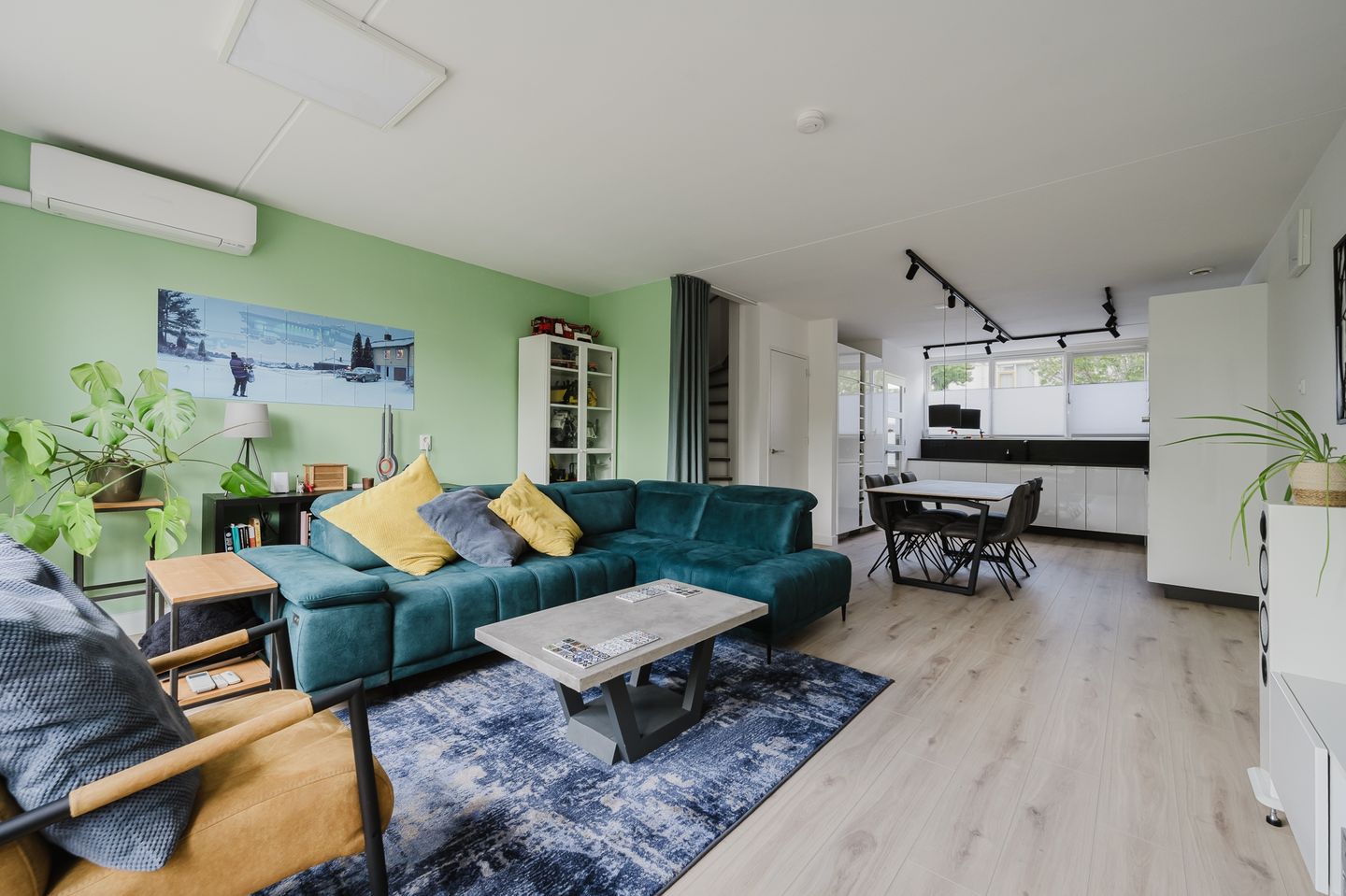 De ruime tuingerichte woonkamer is voorzien van een laminaatvloer en een duo airco systeem.. Door de grote raampartij komt er voldoende licht binnen.
