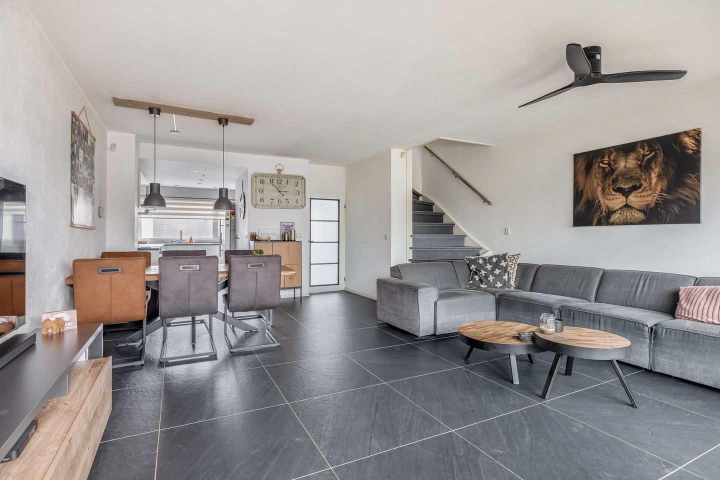 De royale leefruimte is ruim opgezet en geniet dankzij de grote schuifpui van veel natuurlijke lichtinval. De woonkamer biedt volop ruimte voor een comfortabele zithoek en staat in directe verbinding met de achtertuin via de schuifpui. Daarnaast is er voldoende plaats voor een aparte eethoek. In de woonkamer bevindt zich tevens de trapopgang naar de eerste verdieping.
