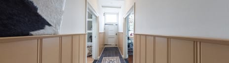 Bij binnenkomst valt direct de lange statige hal op, die toegang geeft tot verschillende leefruimtes. De sfeervolle woonkeuken vormt het hart van de woning en staat via en-suite deuren in verbinding met een separate eetkamer of werkkamer – een ideale plek voor diners of werken in stijl.