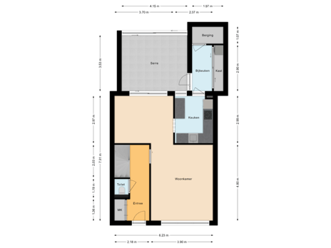 - Bijkeuken met schuifwand, wasmachine-/drogeraansluiting en deur naar serre