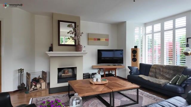 De woonkamer is royaal en licht dankzij de grote raampartij aan de voorzijde en de schuifpui met toegang tot terras aan de zijkant met avondzon en voorzien van een gezellige openhaard.