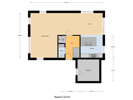 Via de zijentree komt men in de ruime hal voorzien van een toiletruimte, meterkast en vaste trap naar de verdieping. De royale woonkamer heeft een lengte van maar liefst 10,67 meter en biedt veel licht inval. De woonkamer bevindt zich aan de voorzijde en aan de achterzijde is de ruime keuken gesitueerd, uitgerust met een riante schuifpui naar het terras. Verder is de buitenberging van circa 10 m² vanaf de oprit bereikbaar. Er is voldoende ruimte voor twee auto's.