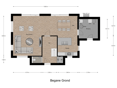 Aan de voorzijde is een royale hal voorzien van een toiletruimte, meterkast en vaste trap naar de eerste verdieping. De royale woonkamer heeft een breedte van circa 10 meter en biedt veel licht inval, vanwege de dubbele schuifpui welke leidt naar de tuin. De woonkamer bevindt zich aan de linkerzijde en aan de rechterzijde is de ruime keuken gesitueerd. Verder is vanuit de keuken de berging bereikbaar van circa 10 m² bereikbaar, die tevens vanaf de oprit toegankelijk is. Er is voldoende ruimte op eigen oprit voor twee parkeerplaatsen.