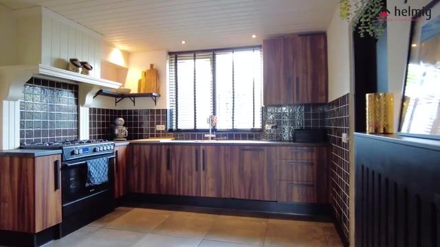 half open keuken waarin geplaatst een hoek opgestelde inbouwkeuken voorzien van een kunststof aanrechtblad met een spoelbak, 5-pits gasfornuis met heteluchtoven, inbouw combi oven/magnetron, -vaatwasser, -afzuigkap, koffiecorner en opstelplaats Amerikaanse koel-/vriescombi, wandafwerking tegels, tegelvloer, plafond afgewerkt met houten kraaldelen;