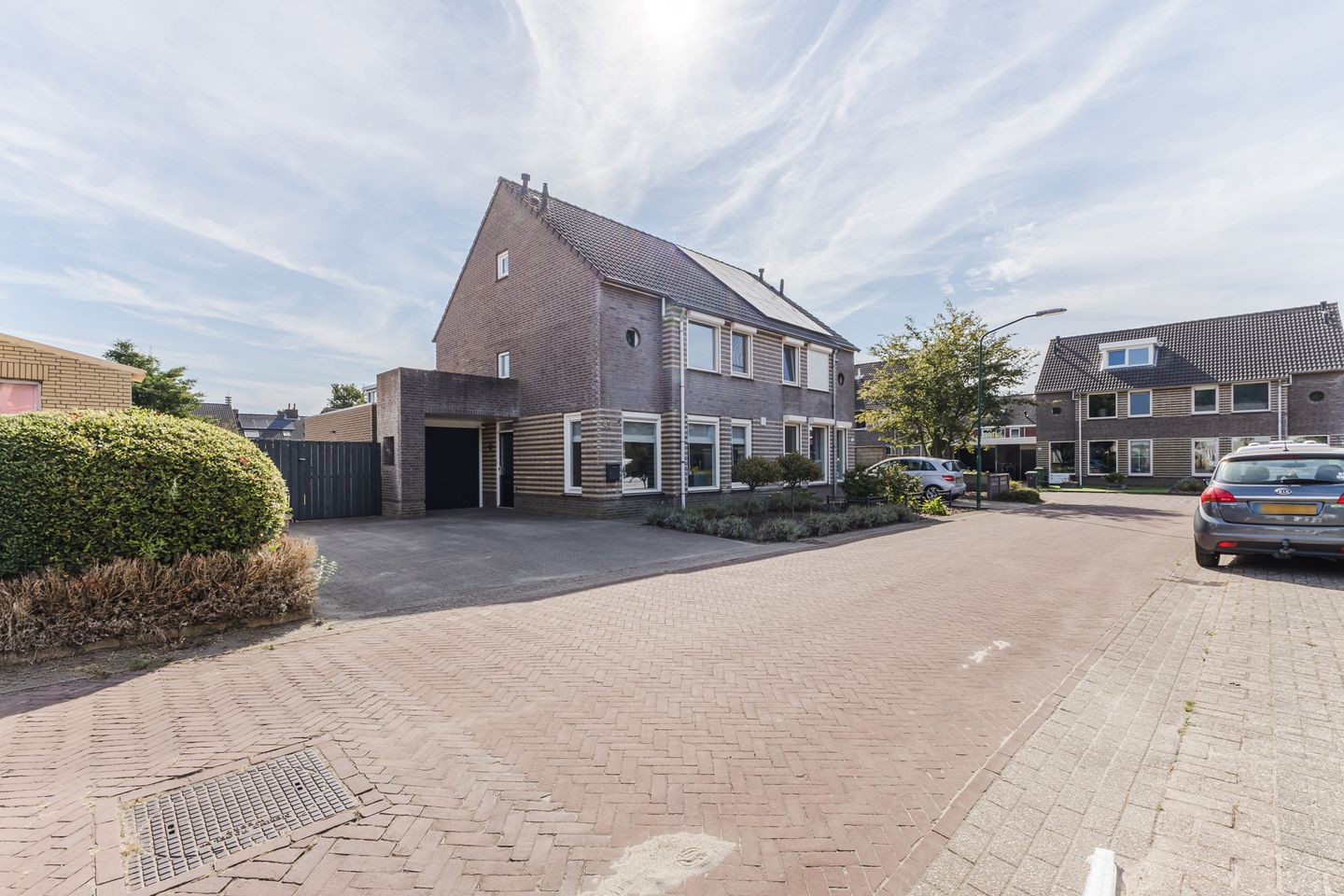 De keurig aangelegde voortuin zorgt voor een fraai aanzicht. De tuin is aangelegd met een plantenborder voorzien van vaste beplanting. Doordat het perceel zeer breed is is de poort van de achterom naast de garage gelegen en kunnen er tot wel 4 auto's op eigen terrein worden geparkeerd.