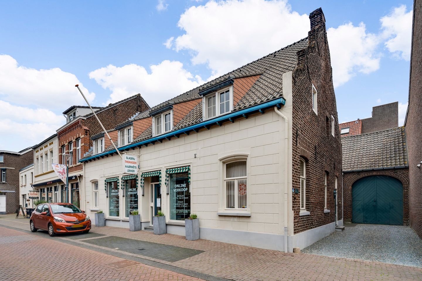Het pand bestaat uit een prachtige commerciële ruimte, voorheen een slagerij die door twee generaties werd gerund, en een aparte bedrijfsruimte met schuur aan de achterzijde. De slagerij sloot in 2018 vanwege het ontbreken van opvolging, maar het pand biedt nog steeds talloze mogelijkheden voor diverse ondernemingen en particulieren.