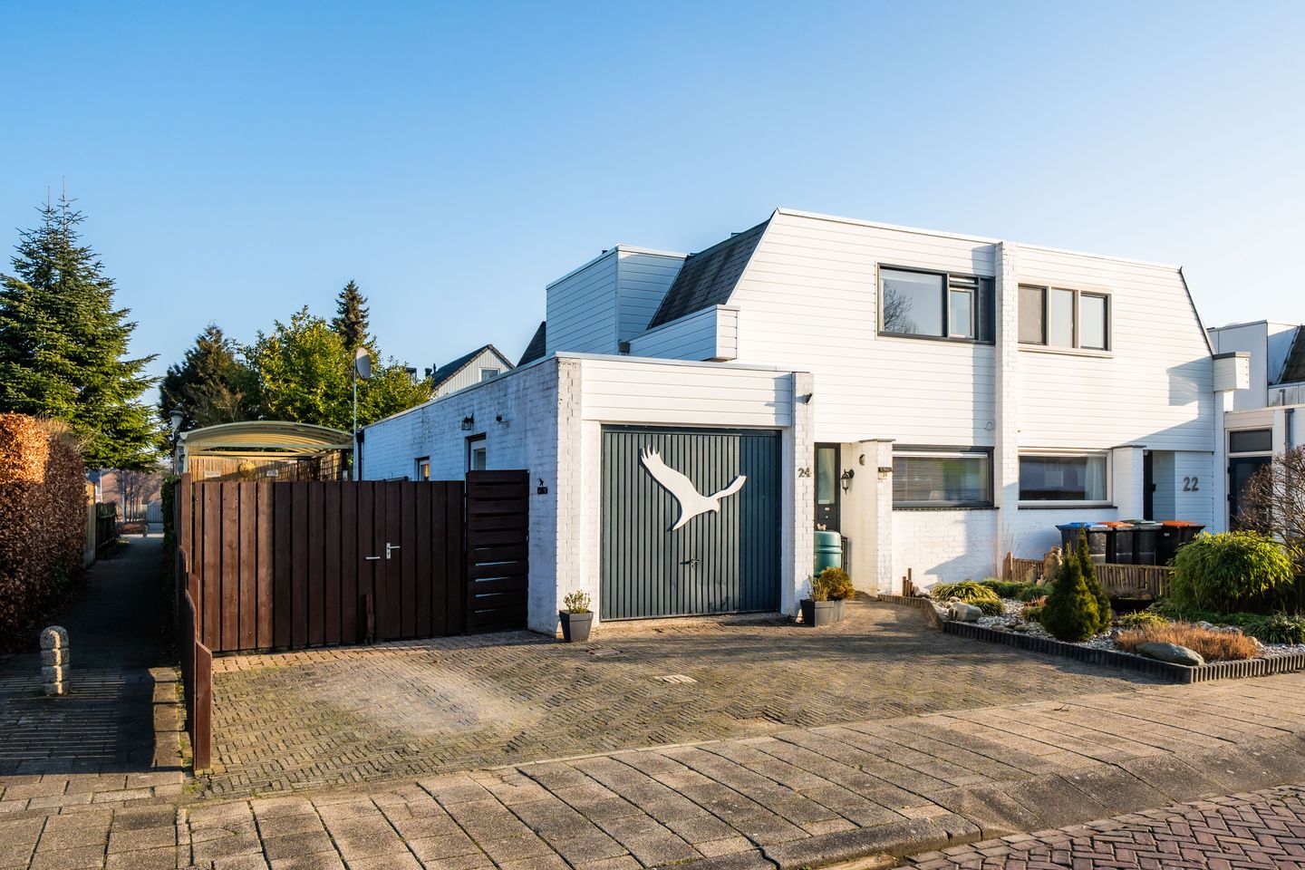 De garage is gelegen aan de voorzijde van de woning en biedt volop ruimte voor het stallen van fietsen, het opbergen van spullen of het creëren van extra bergruimte. De berging is praktisch ingericht en voorzien van de opstelplaats voor de wasmachine en droger en extra opslagruimte. Vanuit de berging is er een deur naar de achtertuin, wat zorgt voor extra gebruiksgemak.