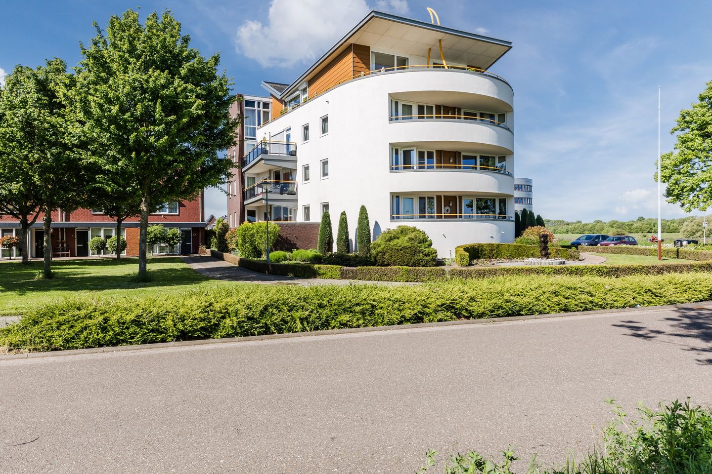 Het prachtige ruimte balkon (ca. 14m2) biedt plek voor voldoende tuinmeubels. Er is een schitterend uitzicht over de uiterwaarden van de Maas en aangrenzende weilanden. Aan de balkonzijde is het windstil. De ligging is uniek! Rondom het gebouw ligt een prachtige parkachtige tuin.