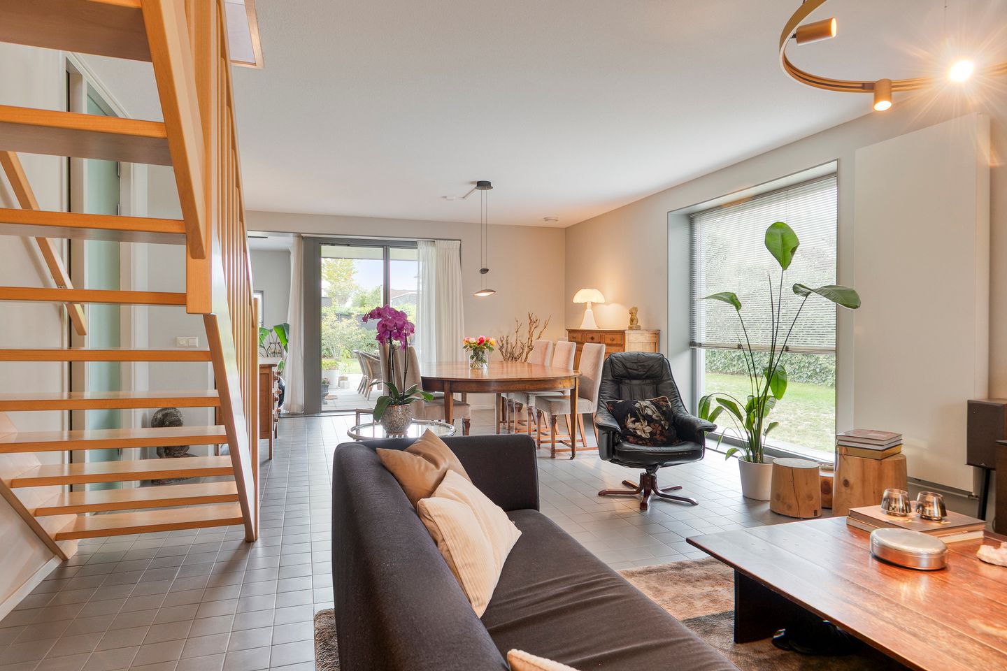 De woonkamer omvat ook een mooie tuinkamer met toegang tot het overdekte terras. Deze ruimte kun je flexibel gebruiken, bijvoorbeeld als extra zithoek, speel- of werkkamer.