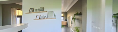 De zitkamer, de eetkamer, de keuken en de hal, er zijn overal doorkijkjes waardoor je de bijzondere, wat stoere inrichting van de individuele ruimten steeds vanuit een andere hoek ziet. Deze ingrijpende verbouwing van een ouderwetse "hokjes indeling" naar een loftgevoel, is gedaan met respect voor het verleden. De haarden, de hoge plafonds, sommige delen van oude wanden de er nog staan, het maakt dat je je nog kunt voorstellen hoe het vroeger geweest moet zijn (en ben je blij dat het nu is zoals het is).