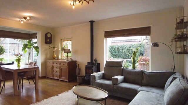 U betreedt de woning via de eigen oprit met carport, met voldoende parkeerplek voor uw auto. De oprit leidt tevens naar de garage, terwijl er in de straat ook voldoende parkeergelegenheid beschikbaar is. Bij binnenkomst komt u in de hal. Vanuit hier heeft u toegang tot de woonkamer, de keuken, de kelder, het toilet en de trapopgang naar de eerste verdieping. De hal vormt daarmee een centraal punt in de woning en verbindt op logische wijze de verschillende leefruimtes met elkaar. De kelder is vanuit de hal te bereiken en biedt een fijne plek voor opslag. De woonkamer vormt het hart van de begane grond en kenmerkt zich door de open indeling en de sfeervolle uitstraling. Hier heeft u alle ruimte om zowel een comfortabele zithoek als een gezellige eethoek te creëren. Grote raampartijen zorgen voor een aangename hoeveelheid daglicht. De houten vloer en de prachtige glas-in-lood elementen versterken het karakter van de woning, terwijl de haard een echte eyecatcher vormt en bijdraagt aan een knusse sfeer. Via en suite deuren bereikt u bovendien een extra kamer, die zich uitstekend leent als werkruimte, speelkamer of rustige leeshoek.