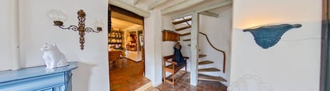 Bij binnenkomst door de overdekte entree, waar de stenen vloer nog de voetstappen van vroegere bewoners lijkt te bewaren, opent zich een wereld waarin geschiedenis en huiselijkheid hand in hand gaan. Een opstapje aan de linkerkant leidt de bezoeker naar de keuken en achterin de hal slingert de wenteltrap naar de bovenverdieping. Hoog boven deze ruimte zweeft een vide met toegang tot de slaapvertrekken. Vanuit de hal is er tevens toegang tot een ruime badkamer met betegelde muren. Hier vindt u een bidet, een ruime douchecabine en een inbouwkast met een praktische aansluiting voor de wasmachine. Verder is hier het toilet met wastafelmeubel te vinden.