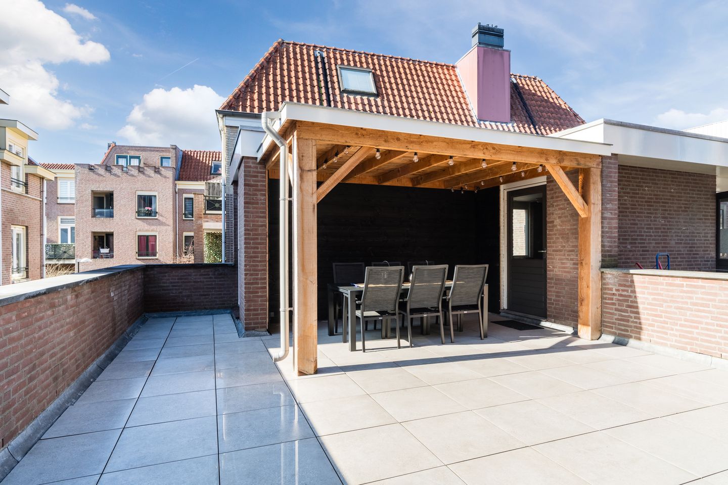 Aan de voorzijde bevindt zich direct het indrukwekkende dakterras van 42 m². Een ideale plek om te ontspannen of gasten te ontvangen.