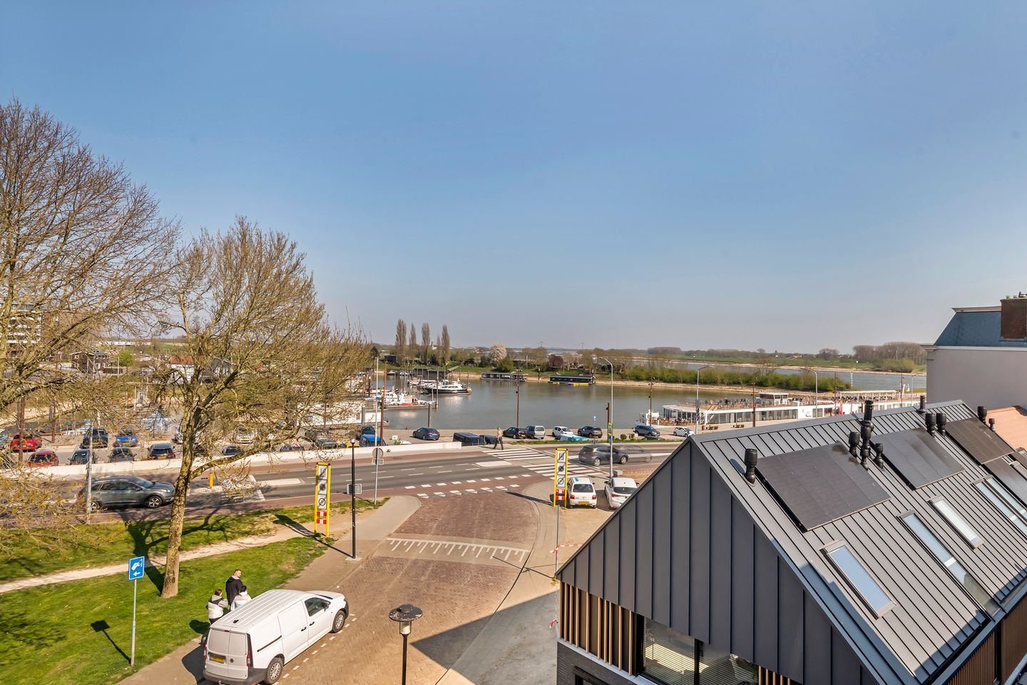 De lift brengt je snel naar de derde verdieping, waar de deuren zich openen en je direct het appartement binnenstapt. Bij binnenkomst valt meteen de enorme lichtinval op, die door de grote ramen en meerdere dubbele openslaande deuren naar de balkons overal in het appartement doordringt. De riante woonkamer is een plek waar je zowel kunt ontspannen als genieten van het uitzicht op de haven en de Waalkade. Of het nu is in de ochtend bij het ontwaken of 's avonds tijdens de zonsondergang, het uitzicht is altijd adembenemend.