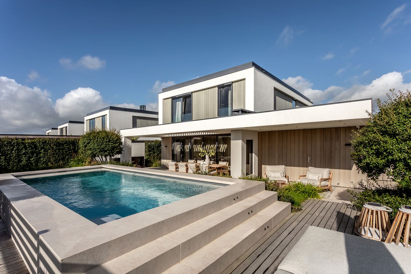 De onder architectuur aangelegde tuin is meer dan een buitenruimte; dit is een privédomein. Volledig omsloten en ontworpen met oog voor design en gemak. Een verwarmd zwembad met verlichting, een buitendouche, een overdekt terras met elektrisch louvredak voorzien van gashaard, poolhouse met toilet en kleedruimte, zitkuil voor 10 personen en prachtige beplanting maken dit tot een werkelijk fantastisch geheel.