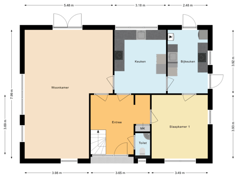 Woonkamer met tuindeuren, vernieuwde keuken met al het wenselijk inbouwapparatuur en bijkeuken met eveneens een nette keuken en inbouwapparatuur, witgoedaansluiting en CV ketel.
