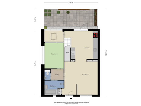 - 26 m² (8,31 meter diep en 3,07 meter breed)