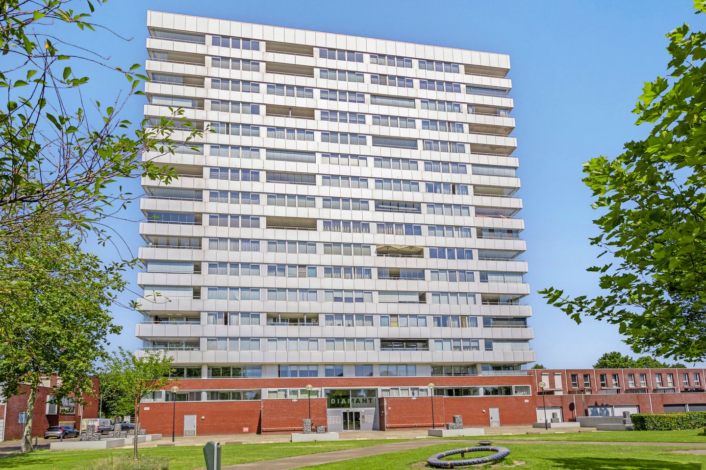De Diamanttoren bestaat uit 16 verdiepingen en een parkeerkelder. Vanuit de centrale hal is de lift bereikbaar en de bergingen. De eigen berging ligt achter de doorgang. Op -1 liggen de eigen parkeerplaatsen. Bij dit appartement horen 2 parkeerplaatsen.