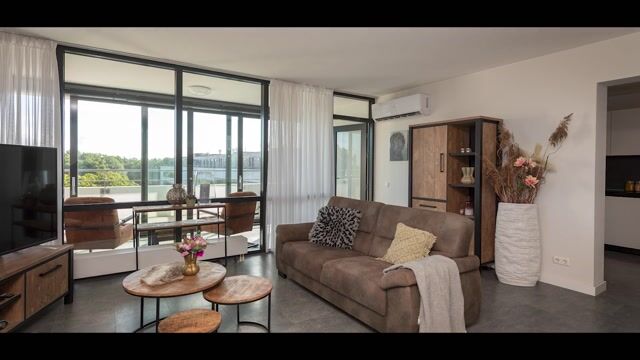 De ruime woonkamer is netjes afgewerkt met een laminaatvloer en stucwerk op de wanden en het plafond. De woonkamer is daarnaast voorzien van airconditioning waarmee u tevens kunt verwarmen. Via een loopdeur bereikt u de wintertuin. De wintertuin is volledig afgesloten van de woonkamer en verleent via een dubbele schuifpui toegang tot het balkon (ca. 7 m²) en heeft een prachtig uitzicht op de groene omgeving. De woonkamer verleent daarnaast toegang tot de keuken. De keuken is opgesteld in een hoek en beschikt over verschillende inbouwapparatuur, te weten: een inductiekookplaat, RVS afzuigkap, combimagnetron, koelkast, RVS spoelbak, en een vaatwasser.
