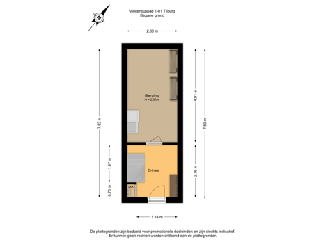 Via het pittoreske Vincentiuspad tref je de voordeur en de entree. Ruime hal met toegang tot de eerste etage, de inpandige berging (begane grond) en de meterkast. De inpandige berging, met een oppervlakte van bijna 13 m², is meer dan voldoende groot voor het stallen van fietsen, het plaatsen van stellingrekken, een wasmachine, droger en/of een extra koelkast of vriezer.