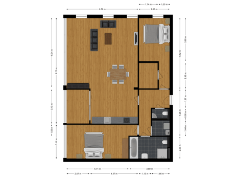 Portiek met fraaie vloerbedekking en de meterkast. Toegang tot de gang/entree met grote berging / inloopkast, tweede berging met de aansluitmogelijkheid t.b.v. de wasapparatuur, inbouwverlichting en de ruime en moderne toiletruimte voorzien van zwevend closet (Villeroy & Boch) en fonteintje. Twee slaapkamers van 12,5 en 16,5 m2 waarvan de hoofdslaapkamer met vaste kast. Verder twee grote schuiframen (aan de oostzijde) voor het heerlijke buitengevoel. De moderne en nette badkamer is ingericht met wastafel, douche, zwevend closet, design-radiator en ligbad. Tevens is er elektrische vloerverwarming aanwezig.