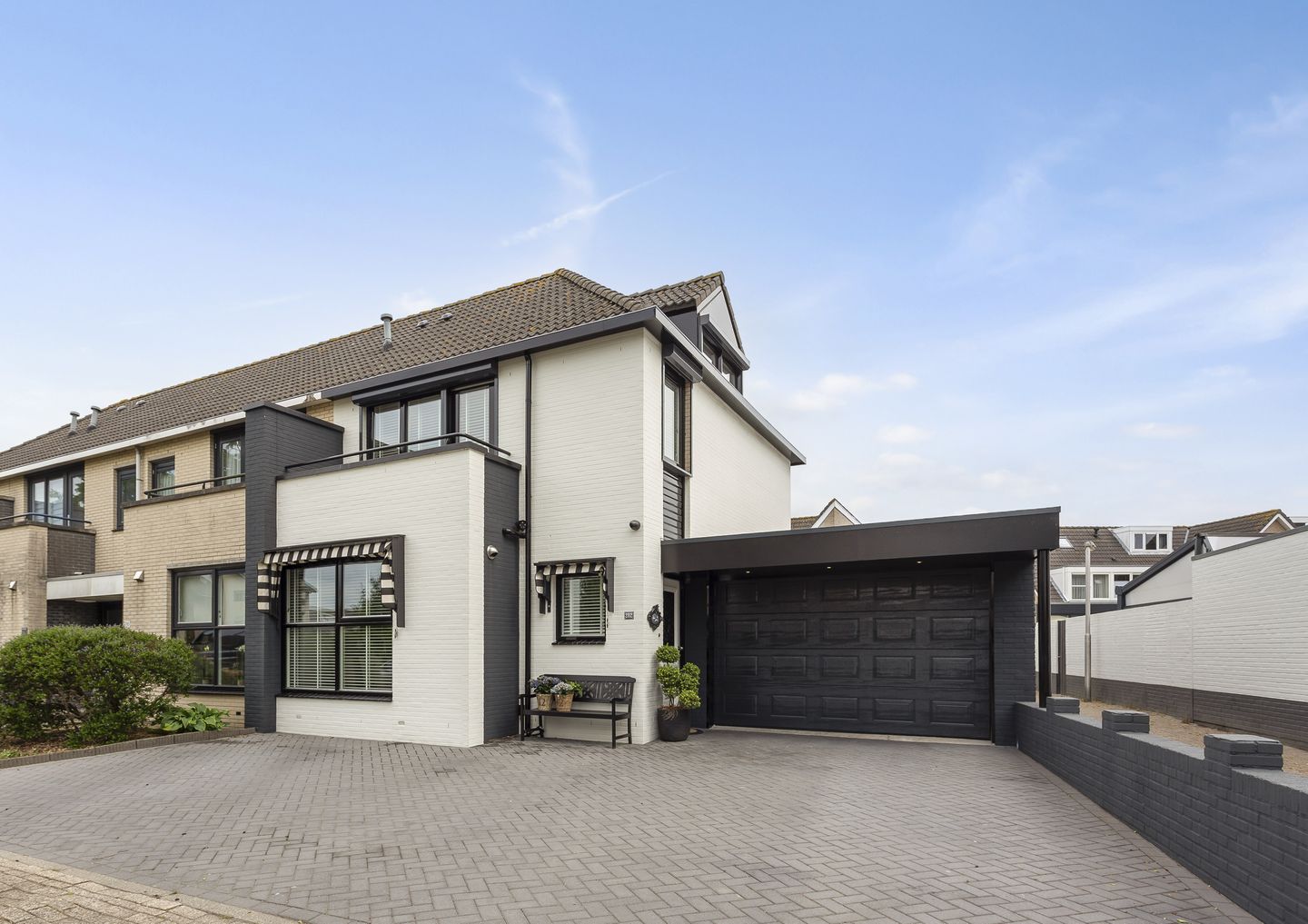 Vanuit de woonkamer en serre is de geheel bestrate achtertuin op het zuidoosten te bereiken. De grote, grijze tegels maken de tuin optisch groter en de zwarte poort geeft toegang tot de steeg. Aan de voorzijde zijn de oprit en de geheel bestrate voortuin waardoor je meerdere auto’s op eigen terrein kunt parkeren.
