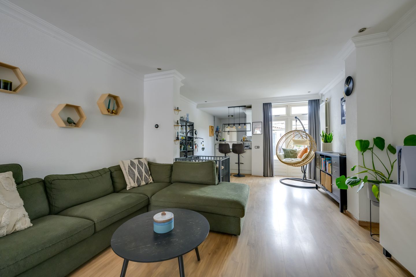 De 40 m² grote woonkamer is aan de achterzijde uitgebouwd en sfeervol afgewerkt met een laminaat vloer, spachtelputz wanden en pleisterwerk plafond met sierlijsten en ingebouwde spots.
