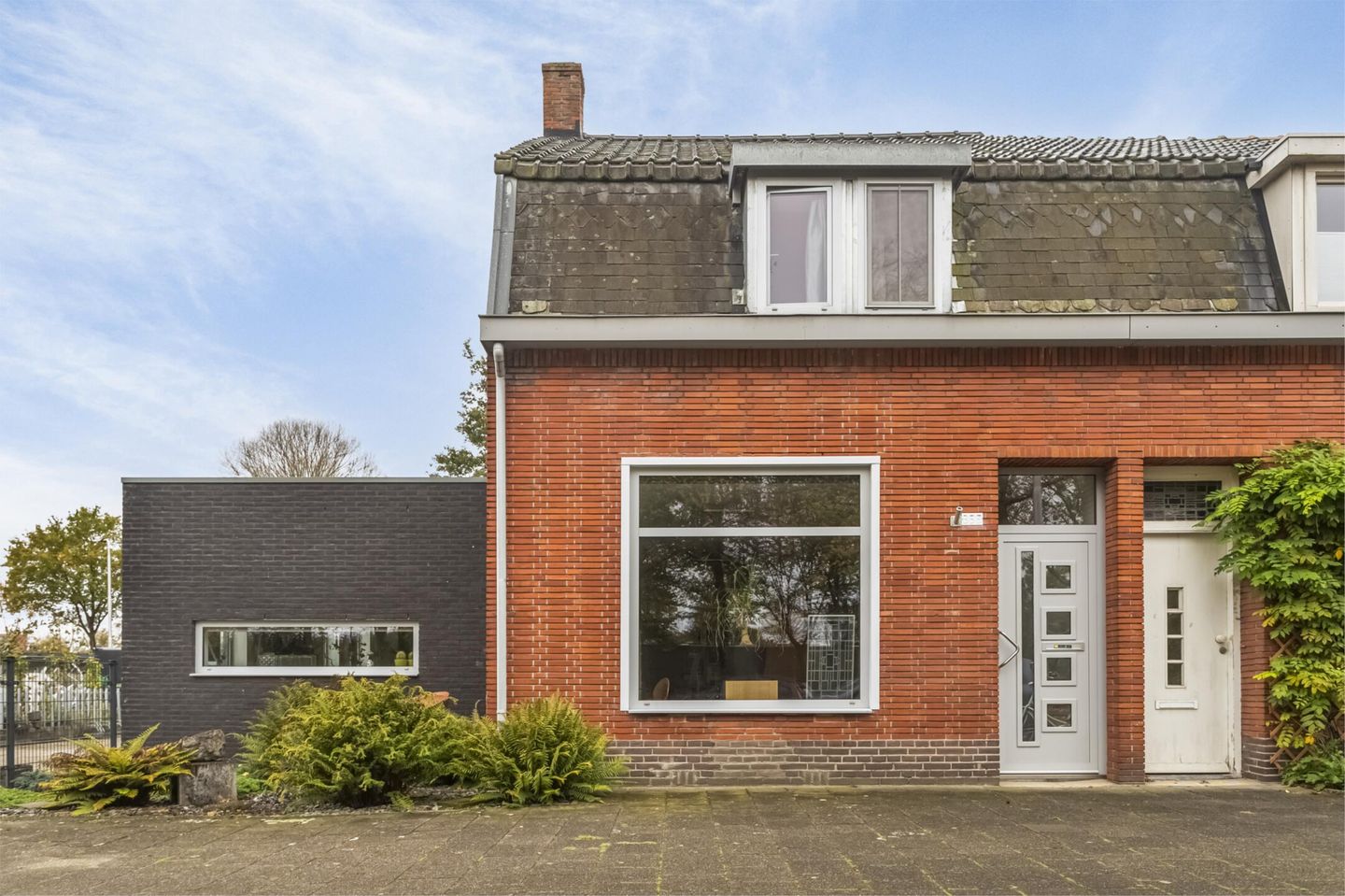 Vanaf de straatzijde loopt een oprit langs het huis naar de garage / werkplaats.