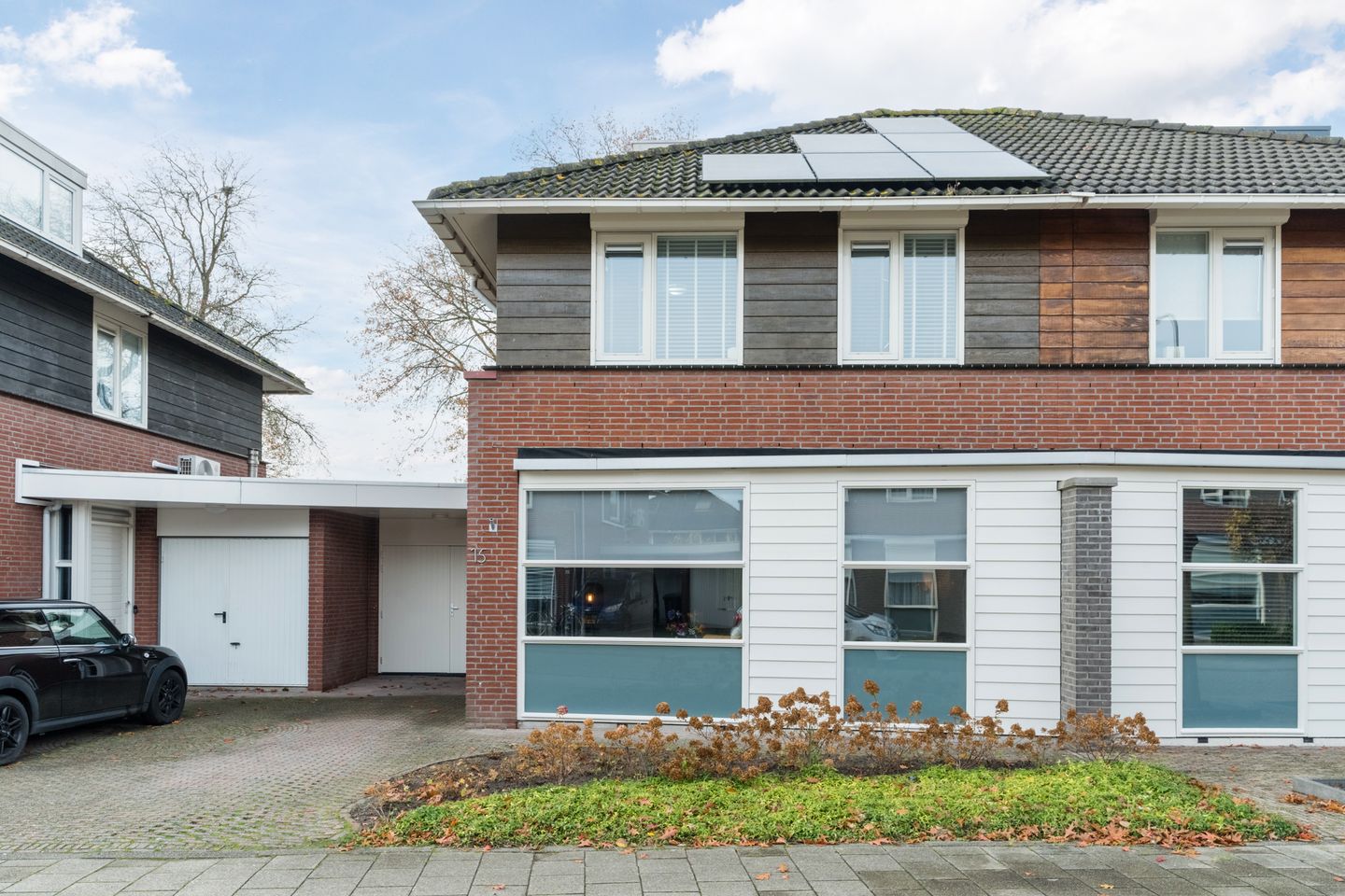 De voortuin is groen, maar toch onderhoudsvriendelijk aangelegd met bodembedekkers en hortensia’s. Met de boodschappen hoef je niet ver te lopen, want de auto kan op de oprit staan.