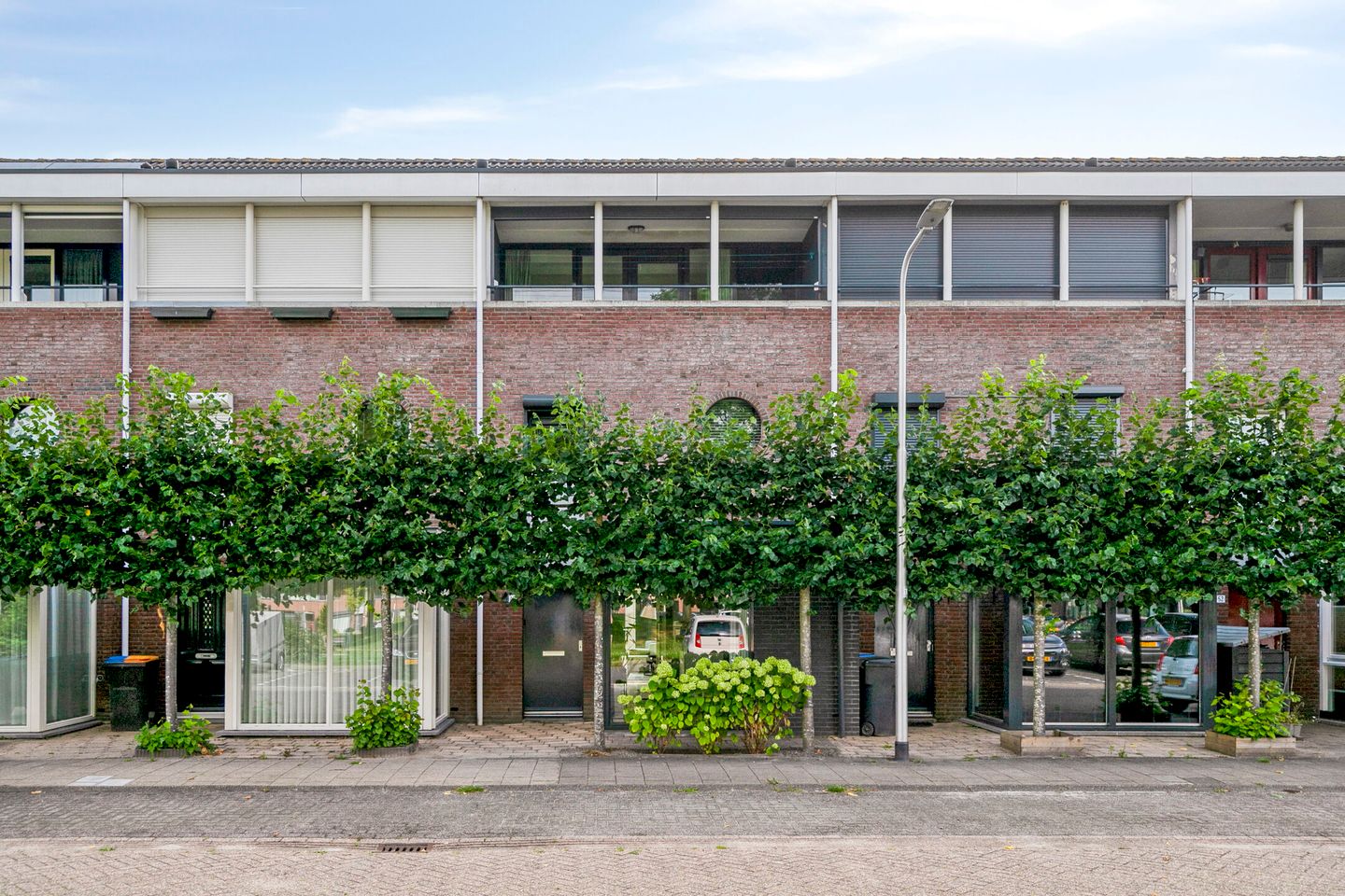 De voortuin is net zo smaakvol ingericht, met hortensia’s en een looppad onder de leibomen door richting de voordeur.