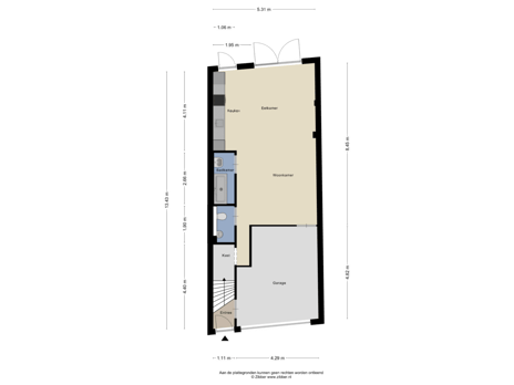 Via de garage komt u in de woonkamer met open keuken en toegang tot de badkamer met bad/douche en wastafel, ruim separaat toilet met de mogelijkheid tot het plaatsen van een wasmachine en opbergruimte.